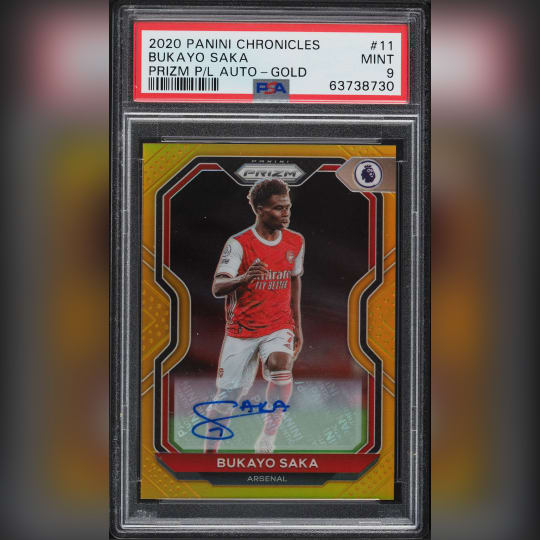 2020 PANINI CHRONICLES PRIZM GOLD PRIZMS BUKAYO SAKA ROOKIE AUTO /10 #11 PSA 9