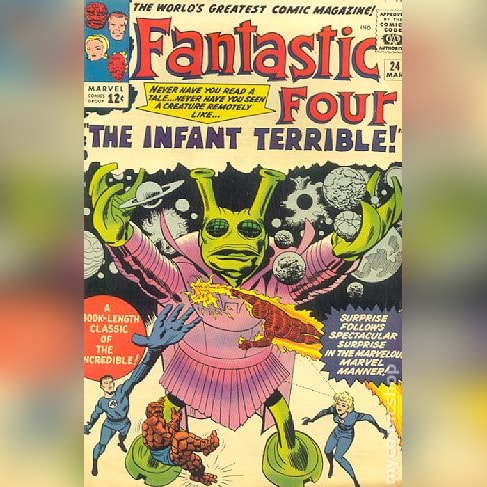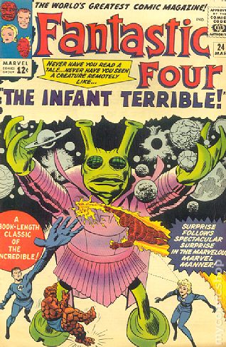 Cover pencils by Jack Kirby, inks by George Roussos. The Infant Terrible!, script by Stan Lee, pencils by Jack Kirby, inks by George Roussos [as Geo. Bell]; An extra-terrestrial wreaks havoc in New York City, until Reed deduces that it is an infant and summons its parents. Letter to the editor from writer Don Glut. 36 pgs. $0.12. Cover price $0.12.