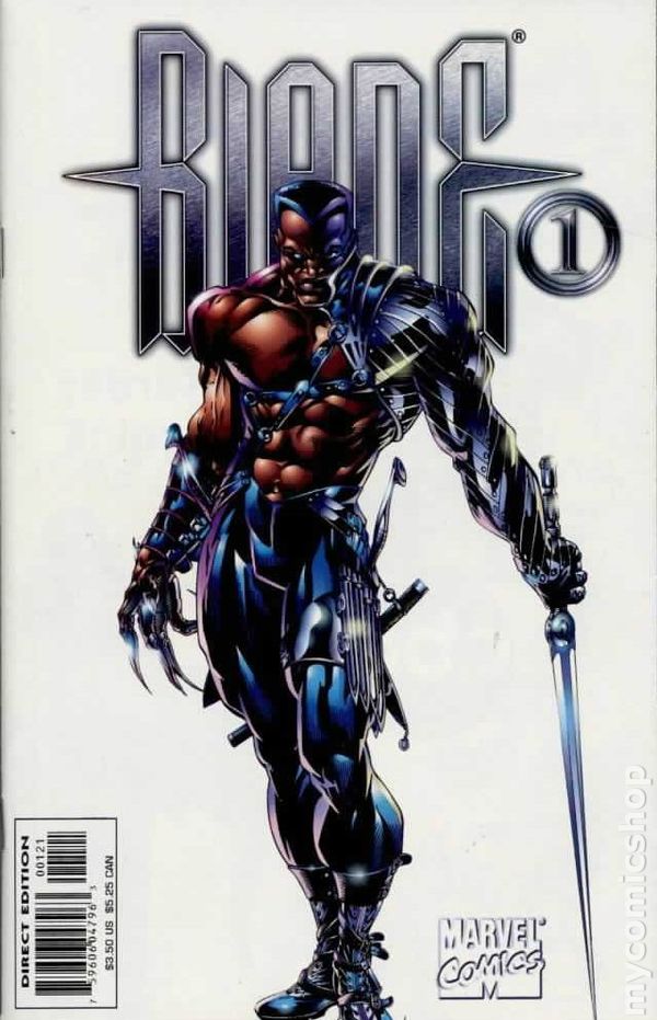 Cover by Bart Sears. THE SCOOP: The vampire hunter leaps from the silver screen to his own hard-hitting, hyper- kinetic ongoing series! * THE STORY: There is a dark movement creeping through the night--a gathering of the bloodsucking kind! And this vampiric convention heralds the coming of the most terrifying demonic entity ever-- the dreaded Daywalker! Only one man possesses the means to halt this unholy entrance, and that man is Blade, the half-vampire/half-human warrior! But what if the slayer himself is slain? And who are the mysterious agents of Silvereye that are watching all? It's X-Files meets The Lost Boys! It's the supernatural meets super heroics! It's cool new characters like the Reaper, Saracen the monk and Hrolf the hunter! It's demons, vampires, the undead and the barely living! It's a high adrenaline adventure that'll make the movie look like Polaroids! It's Blade like you've never seen him--but always wanted to! This isn't goofy goggles and splintering stakes--it's hi-tech horror in the Mighty Marvel Manner! * THE CREATORS: Bart Sears (SPIDER-WOMAN) was so intrigued by the slayer that he leaped at the chance to both write and draw the title! Just wait until you see the new characters he's cooked up! * THE FORMAT: This 48-page issue kicks off the monthly series. * THE SUPPORT: Look for ads, articles, online coverage and P.O.P. items. And don't forget the continuing mass market awareness of the character: Blade has been rented more than 20 million times since its video release in December of 1998, while sales of the Blade DVD have remained in the top 20 since December 1998, making it the 3rd best selling DVD of all time! * MARVEL MEMO: Dynamic Forces will offer a signed version of BLADE: VAMPIRE HUNTER #1. Please refer to the DF section for full details on this exciting collectors' item." Cover price $3.50.