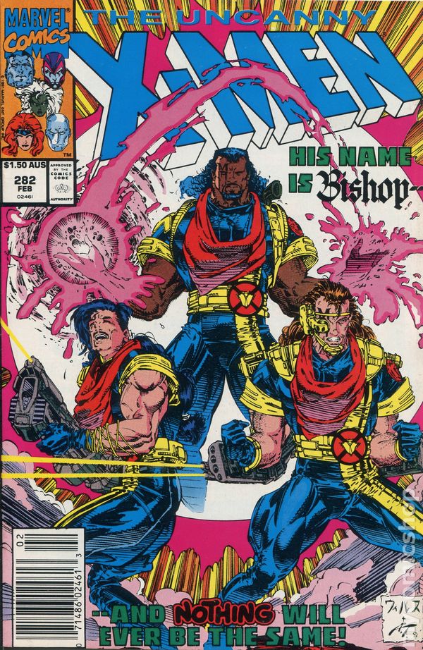 Australian Price Variant. $1.50 AUS. "Payback!" Story by Whilce Portacio and John Byrne. Art by Whilce Portacio and Art Thibert. In one fell swoop the Upstarts have destroyed the Reavers and crippled the Hellfire Club. Next up, the Mutant Liberation Front. Who can stop these powerful new foes? Enter: Bishop! NOTE: 1st appearance of Bishop.