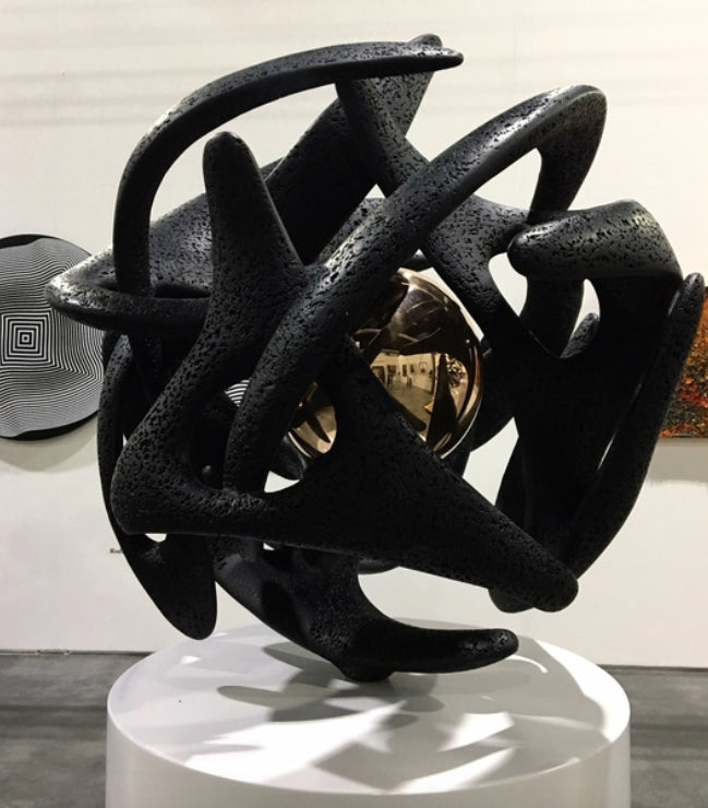 The artist shapes his sculptures inspired by biomorphic tissue and the labyrinth, symbolizing the tortuous path of humanity looking for its essence, and revealing his recious soul. Meggiato thus invents the concept of “introsculpture” in which the observer point of view is drawn towards the inner part in the artwork, not only restricting on the surface. «On a formal level, space and light don’t define the work, sliding over it as if it were in-the-round; they indeed penetrate inside it, wrapping its lattices and tangles, reaching the central sphere point as as a quintessential point of arrival»