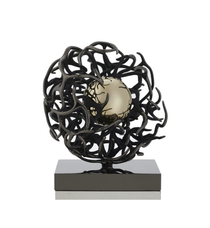 The artist shapes his sculptures inspired by biomorphic tissue and the labyrinth, symbolizing the tortuous path of humanity looking for its essence, and revealing his recious soul. Meggiato thus invents the concept of “introsculpture” in which the observer point of view is drawn towards the inner part in the artwork, not only restricting on the surface. «On a formal level, space and light don’t define the work, sliding over it as if it were in-the-round; they indeed penetrate inside it, wrapping its lattices and tangles, reaching the central sphere point as as a quintessential point of arrival»