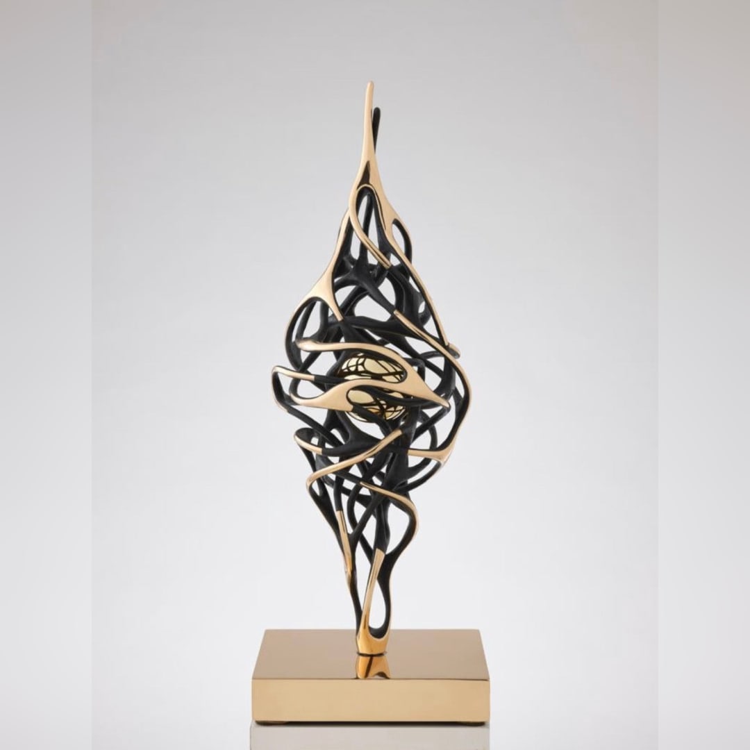 The artist shapes his sculptures inspired by biomorphic tissue and the labyrinth, symbolizing the tortuous path of humanity looking for its essence, and revealing his recious soul. Meggiato thus invents the concept of “introsculpture” in which the observer point of view is drawn towards the inner part in the artwork, not only restricting on the surface. «On a formal level, space and light don’t define the work, sliding over it as if it were in-the-round; they indeed penetrate inside it, wrapping its lattices and tangles, reaching the central sphere point as as a quintessential point of arrival»