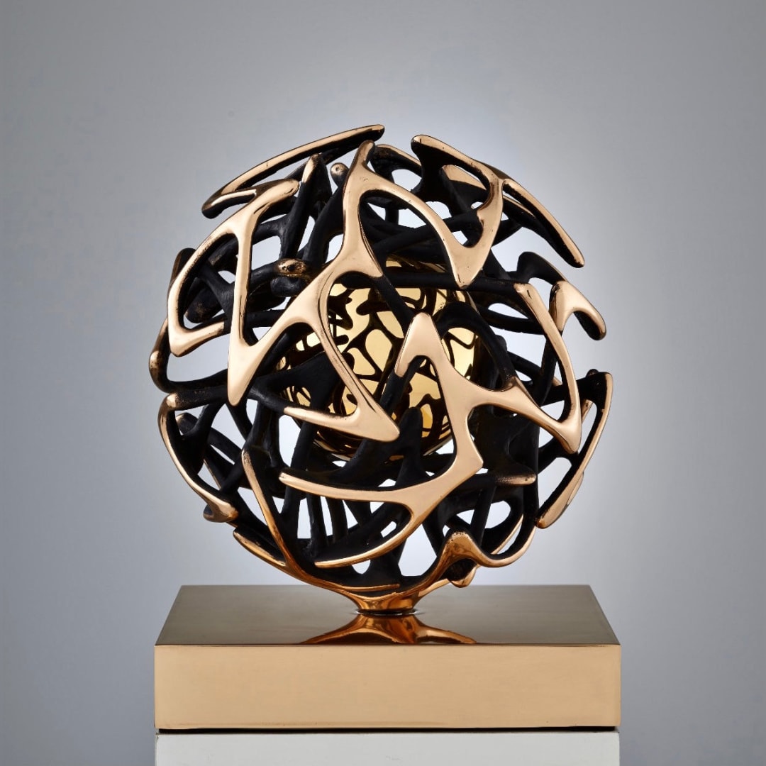 Gianfranco Meggiato shapes his sculptures inspired by biomorphic tissue and the labyrinth, symbolizing the tortuous path of humanity looking for its essence, and revealing his recious soul. Meggiato thus invents the concept of “introsculpture” in which the observer point of view is drawn towards the inner part in the artwork, not only restricting on the surface. «On a formal level, space and light don’t define the work, sliding over it as if it were in-the-round; they indeed penetrate inside it, wrapping its lattices and tangles, reaching the central sphere point as as a quintessential point of arrival».