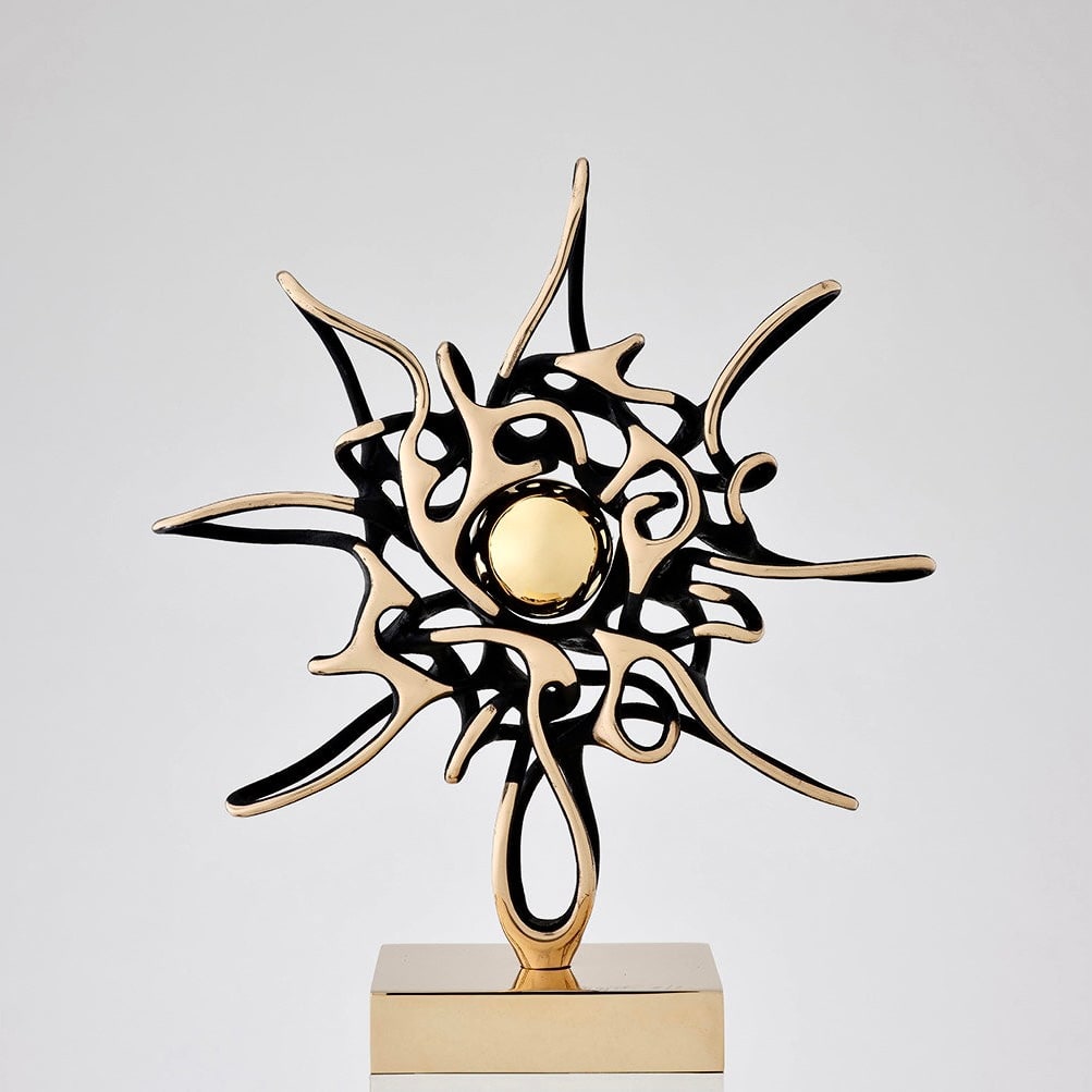 Gianfranco Meggiato shapes his sculptures inspired by biomorphic tissue and the labyrinth, symbolizing the tortuous path of humanity looking for its essence, and revealing his recious soul. Meggiato thus invents the concept of “introsculpture” in which the observer point of view is drawn towards the inner part in the artwork, not only restricting on the surface. «On a formal level, space and light don’t define the work, sliding over it as if it were in-the-round; they indeed penetrate inside it, wrapping its lattices and tangles, reaching the central sphere point as as a quintessential point of arrival».