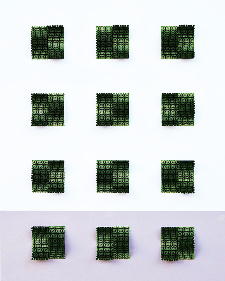 “Moments in Color” is a new series I created, where I wanted to play around with color combinations and patterned shapes. As a sculptor first, color was never an element that I focused on, but as the years have gone by, my curiosity with color has grown, and I immensely enjoy the subtleties that color provides as an emotion and a feeling. This new series is all about color, where I use two background colors, and then a gradient complimentary color on the screws. The squares of screws are patterns and shapes, so there’s the movement of high to low and side to side, and I get to play around with color combinations. I wanted something abstract yet structured; that’s the way my mind works."