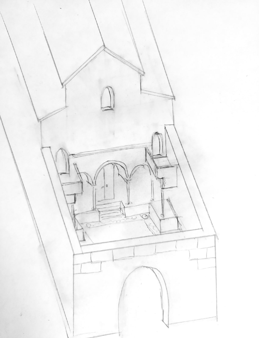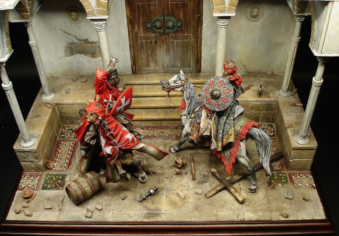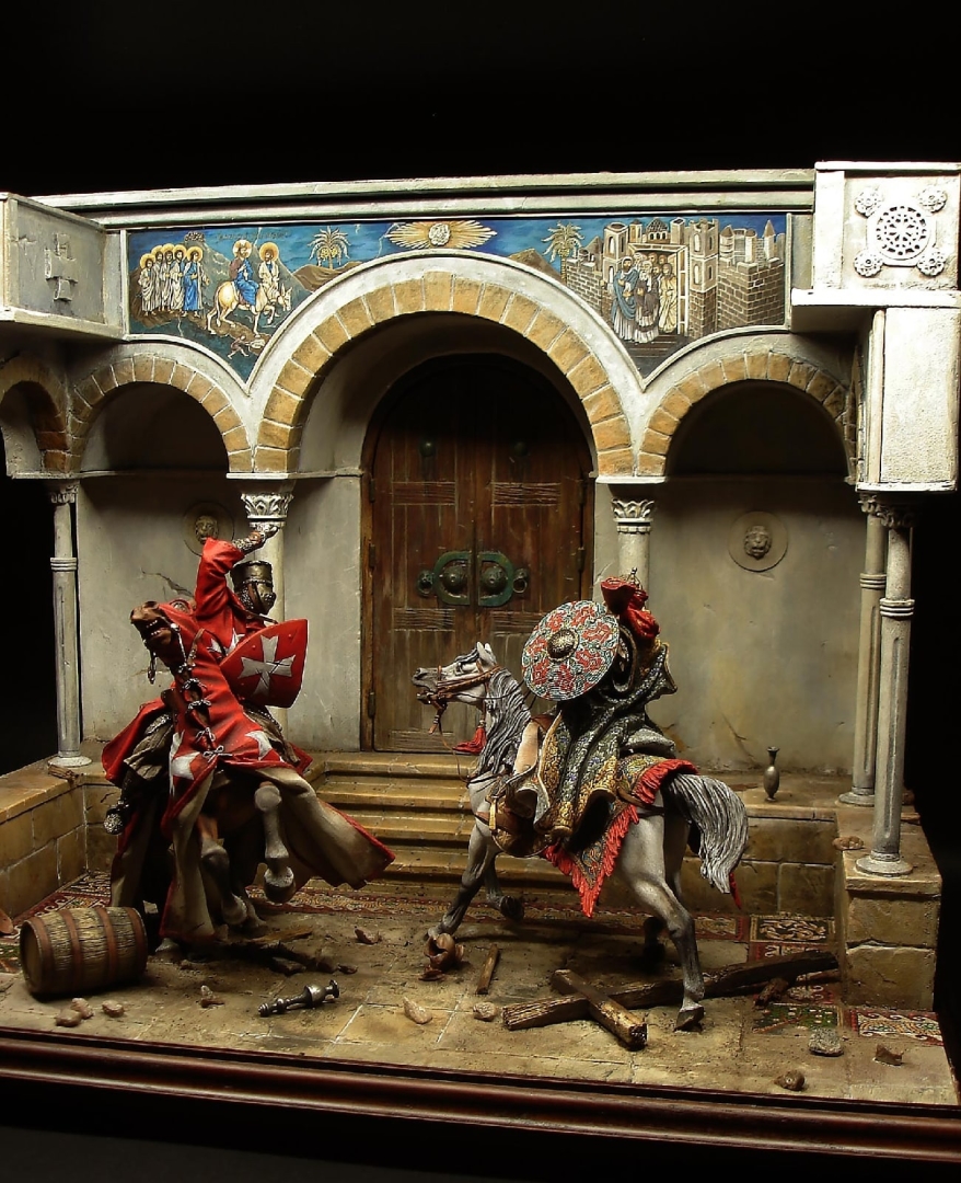 Диорама от Виталия Пузенко. Размер 26см на 37см, высота 38см. В диораме представлена часть атриума христианской церкви. Христиани отмечали праздник, вынесли для прихожан скамью, бочки с вином, посуду и крест. Увидев это сарацины решили наказать иноверцев. Проезжавший мимо рыцарь встал на защиту прихожан.