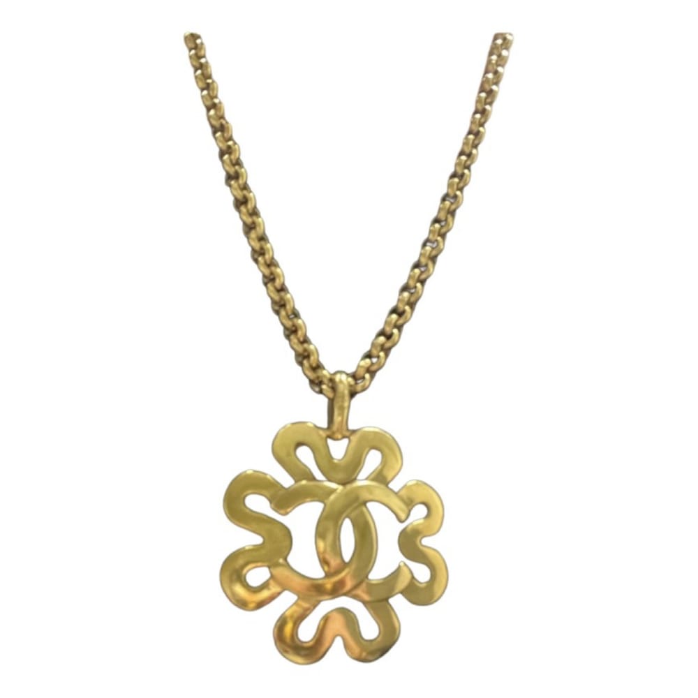 Vintage 1995 Chanel gold-plated necklace with cutout border pendant featuring interlocking 'CC' logo. Chain length is 23 inches.
