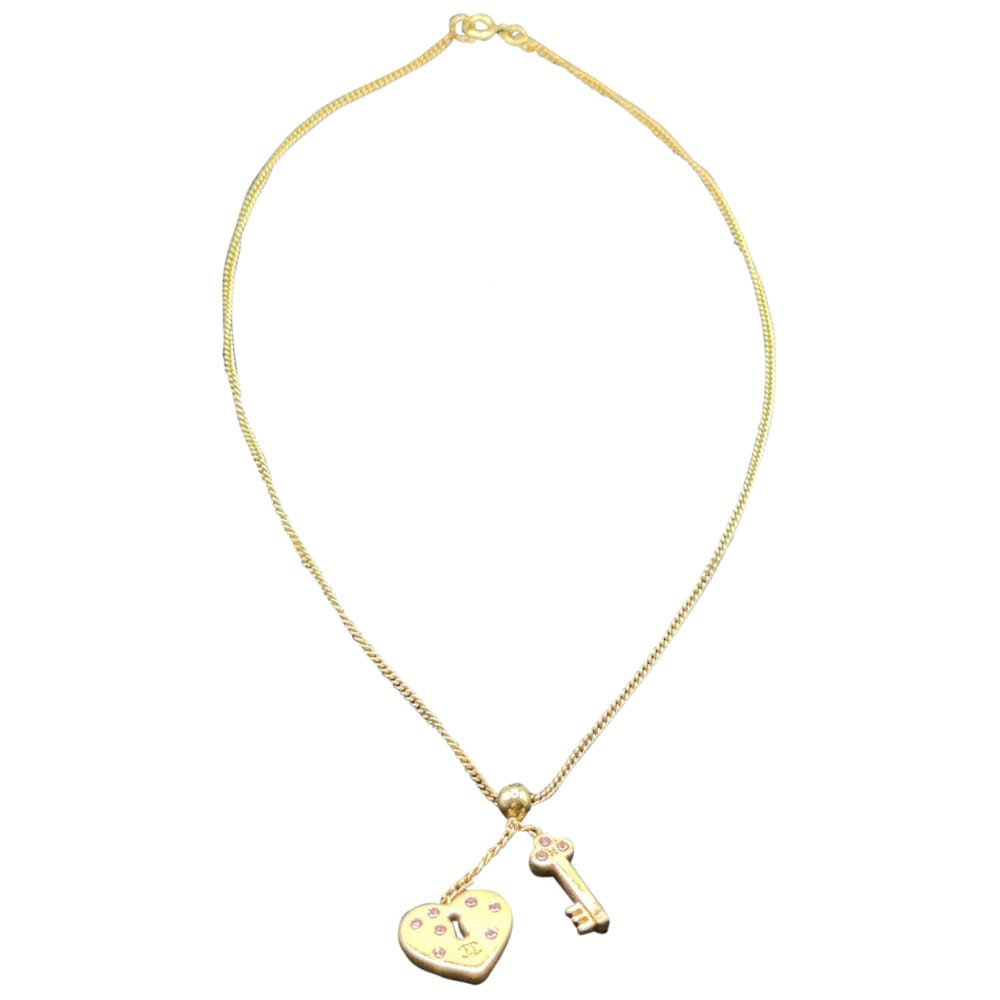 Highly sought after Chanel Heart Lock and Key Rhinestone Motif Necklace! Features CC logo motif on both heart lock and key adorned with purple rhinestones. Pendants show light scratches. Necklace only, no box. Scuffs or scratches