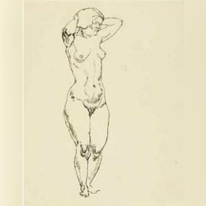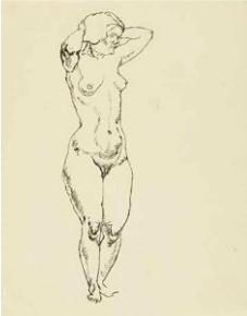 Stehender weiblicher Akt mit Armen hinter dem Kopf verschränkt
