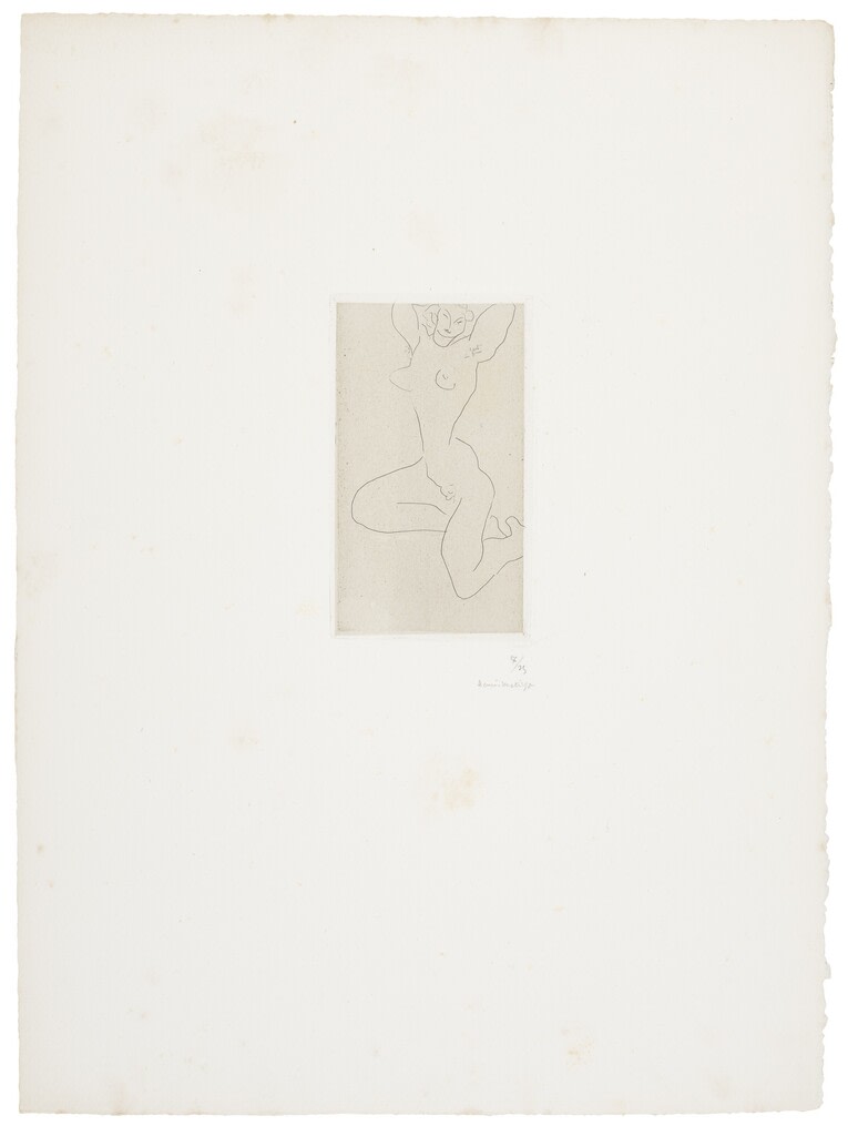 Nu assis sur la jambe droite, bras levés