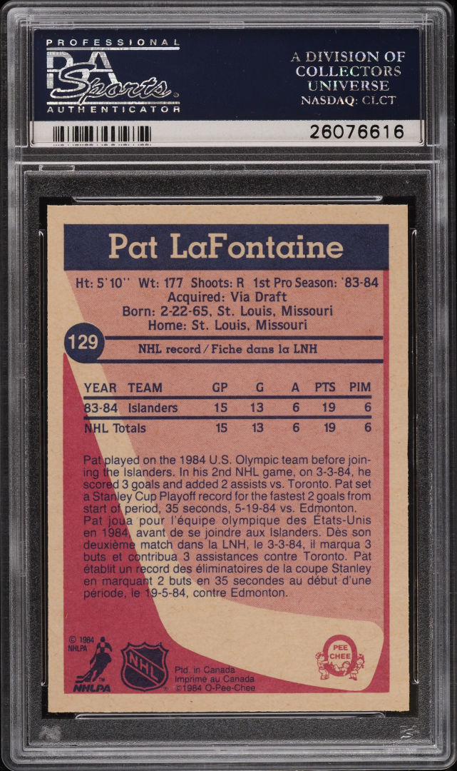 1984 O-PEE-CHEE HOCKEY PAT LAFONTAINE ROOKIE #129 PSA 10 GEM MINT